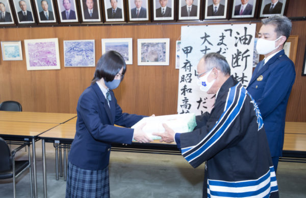 令和二年度秋の全国交通安全運動で、本校書道部が「書による交通安全メッセージ」を揮毫し、イオンモール甲府昭和店に掲示し、交通安全のメッセージのPRをしたことに対して、南甲府警察署・南甲府交通安全協会・南甲府安全運転管理者協議会より感謝状と記念品をいただきました。