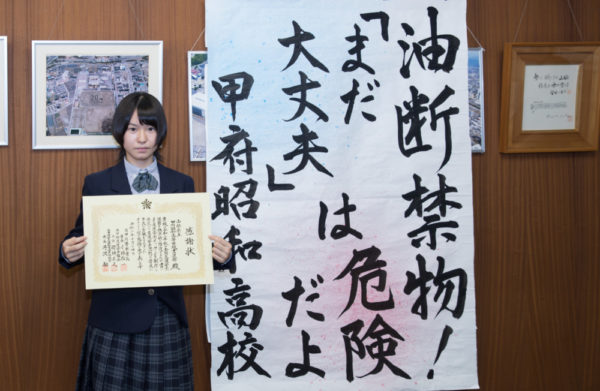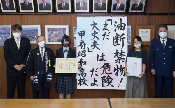 山梨県立甲府昭和高等学校 > 学校の様子 > 部活動 > 書道 > 南甲府警察署から書道部に感謝状 2020年10月15日カテゴリー: 学校の様子 部活動 書道 南甲府警察署から書道部に感謝状 10月14日 令和二年度秋の全国交通安全運動で、本校書道部が「書による交通安全メッセージ」を揮毫し、イオンモール甲府昭和店に掲示し、交通安全のメッセージのPRをしたことに対して、南甲府警察署・南甲府交通安全協会・南甲府安全運転管理者協議会より感謝状と記念品をいただきました。 10月14日放課後、本校校長室で、書道部部長の細田瞳さん(2年押原中出身)が部員を代表して、感謝状を受け取りました。