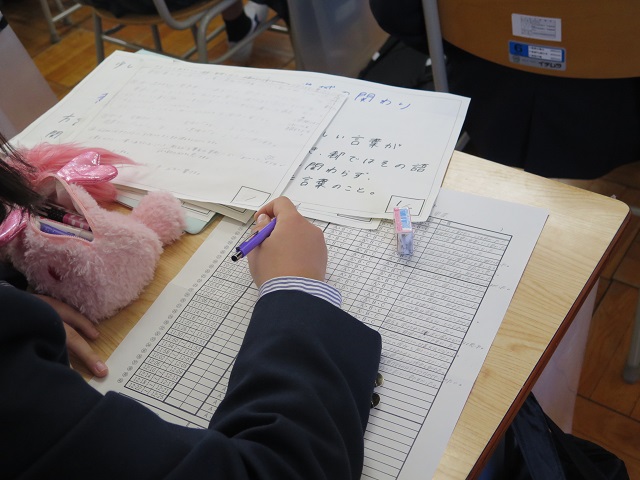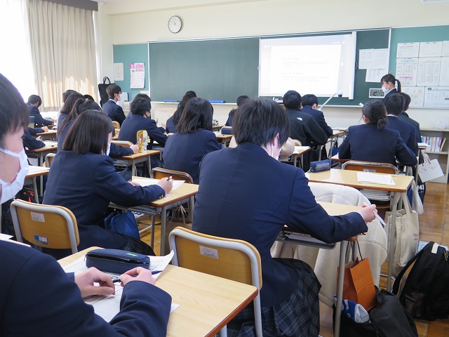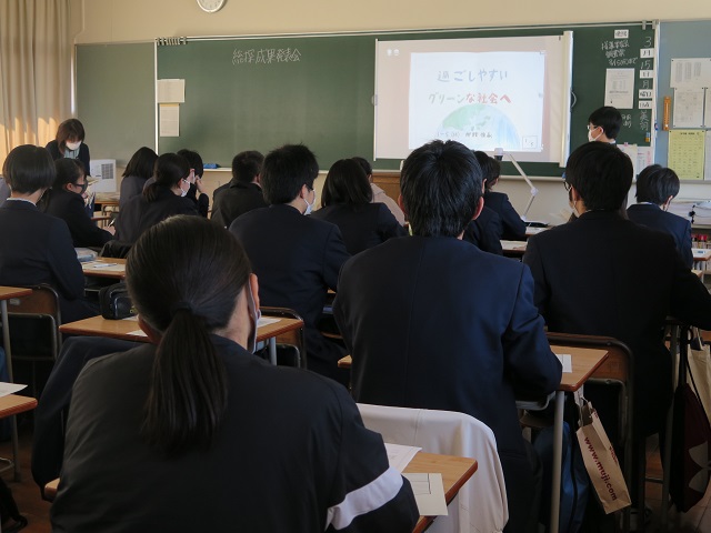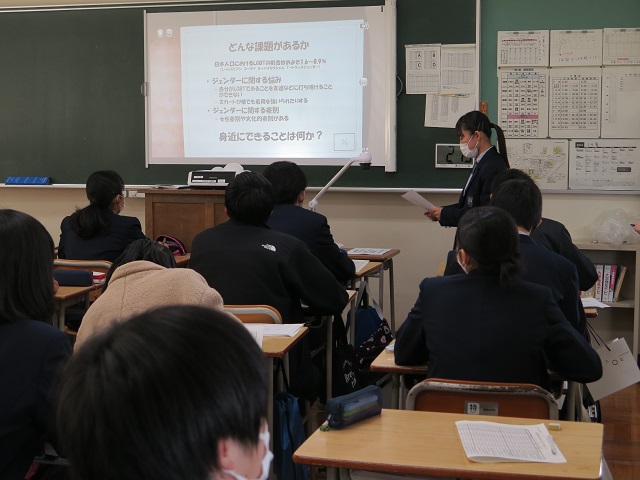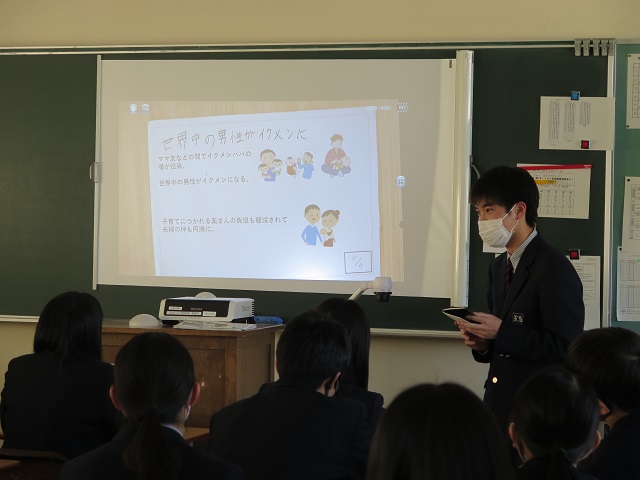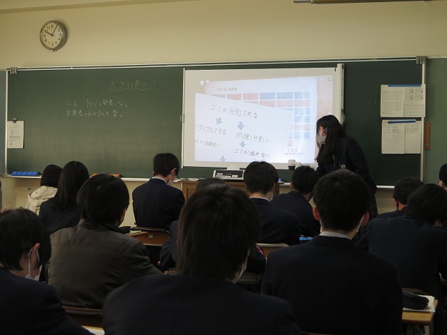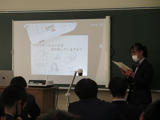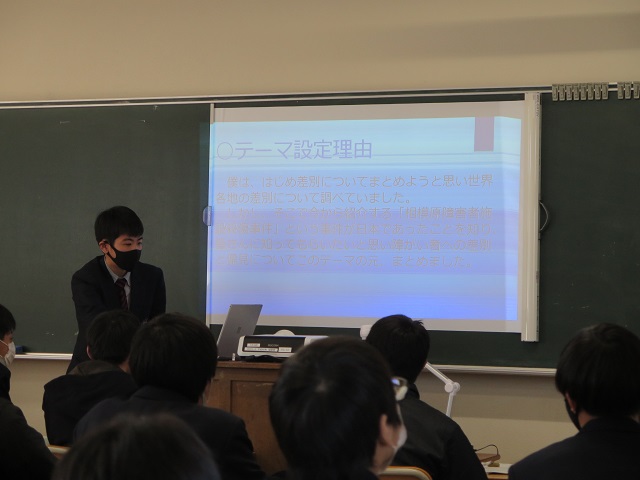 1人5分程度の発表を全ての生徒が行い、発表しない時間は他の生徒の発表を聞き評価も行いました。