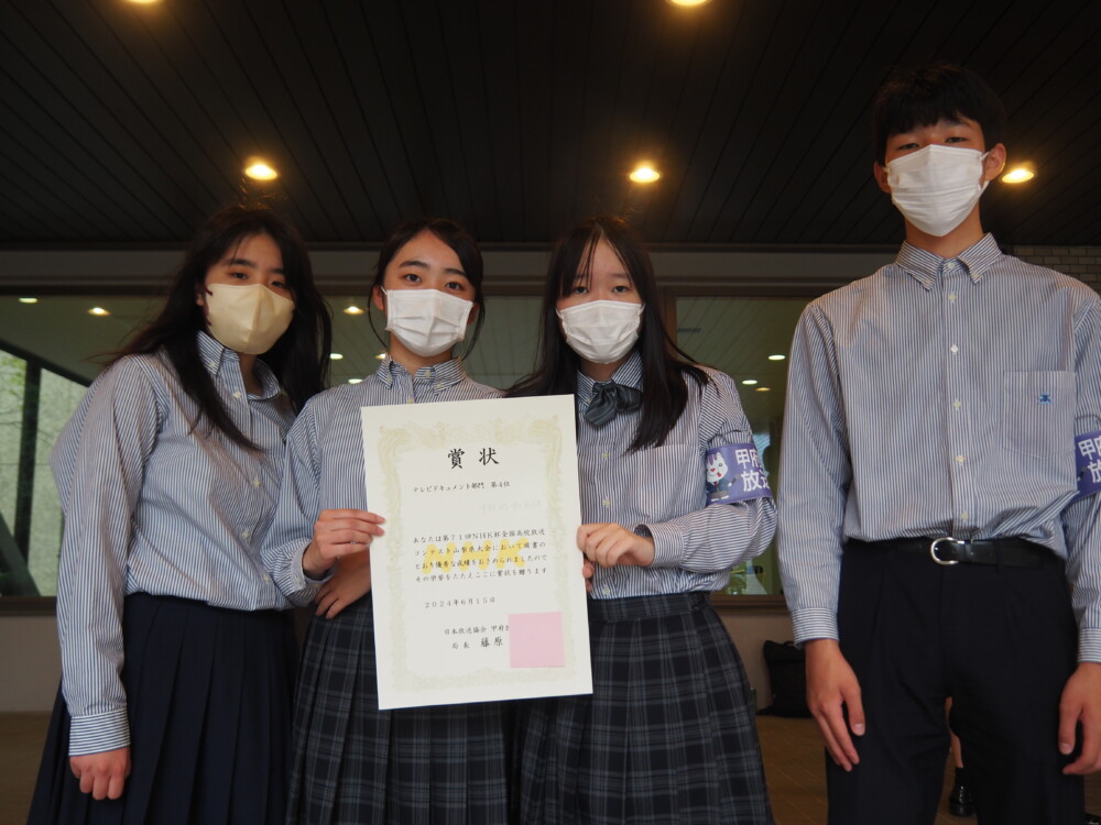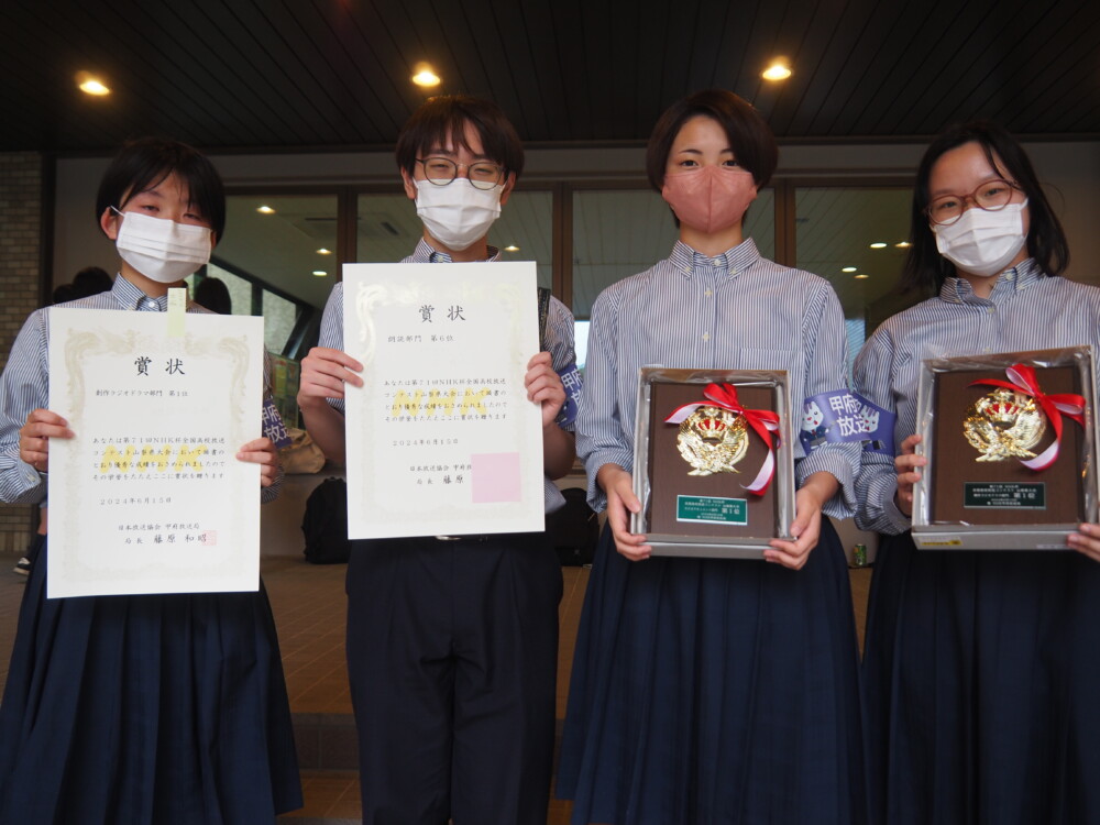 山梨県立甲府昭和高等学校 > 学校の様子 > 部活動 > 放送 > 【放送部】NHK杯全国大会4部門出場へ 2024年6月18日カテゴリー: 学校の様子 部活動 放送 【放送部】NHK杯全国大会4部門出場へ 6月15日(土) NHK杯全国高校放送コンテスト山梨県大会が行われ、創作ラジオドラマ部門が第1位・ラジオドキュメント部門が第1位・テレビドキュメント部門が第4位に入賞しました。また3年今 稜太さんの「レキシントンの幽霊」の朗読が6位入賞し、全国大会へ4部門、出場できることになりました。入賞は逃した出場者もそれぞれが練習の成果を発揮して素晴らしい読みを披露できました。全国大会は7月23日から3日間東京で行われます。
