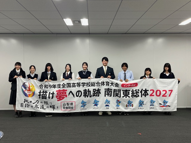 2027年に南関東でインターハイが開催され、30競技のうち8競技が山梨県での開催となります。そこで、7日に各校から1名活動推進委員が集まり、第一回総会が行われました。本校からは、1年4組の上野綾花さんが参加し、なぎなた分科会の代表委員に選出されました。2年後のインターハイ開催に向けて、様々な準備や活動に尽力していきます!