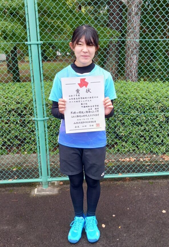山梨県立甲府昭和高等学校 > 学校の様子 > 部活動 > 女子テニス > R7山梨県高等学校新人大会テニス大会女子シングルス第2位 2025年10月27日カテゴリー: 学校の様子 部活動 女子テニス R7山梨県高等学校新人大会テニス大会女子シングルス第2位 10月25日(土)小瀬スポーツ公園テニス場で行われた 新人大会女子シングルスで第2位になりました。