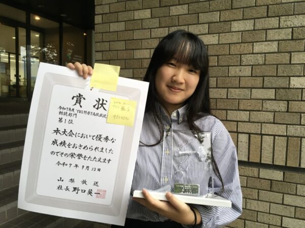 9月14日(土)に山梨市民会館で行われた令和7年度「YBS杯県下高校放送コンテスト」において、放送部2年の十川藍子さんが作「西の魔女が死んだ」の一場面を情感豊かに朗読し朗読部門第1位に入賞しました。また、ラジオ番組制作PR部門では、「「駅に虫?」」が優秀賞を、テレビ番組制作PR部門では「こだわりをすすれ!!」「蛍のいるところ」